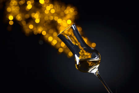 Glass of alcoholic drink on a dark background. Copy space.