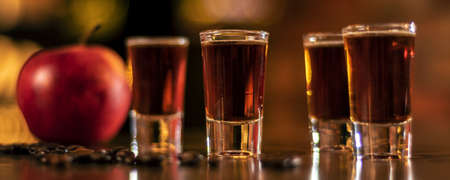 alcohol shots coffee beans and apple on bar table on blurred background panorama