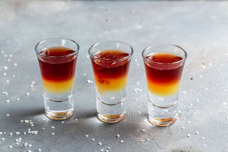 Three layered shots. Set of cocktails at the bar. alcoholic cocktail shot.