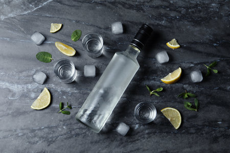 Bottle of vodka, shot glasses, lemon, mint and ice on black marble table, flat lay