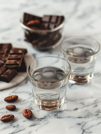 Artistic display of dark chocolate pieces next to clear glasses of cocoa water, with whole cacao beans scattered on a marble surface.