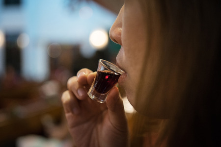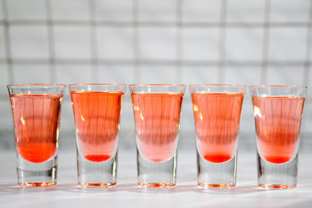 Red, strong alcoholic drink in small glasses on bar waiting to be served