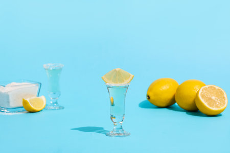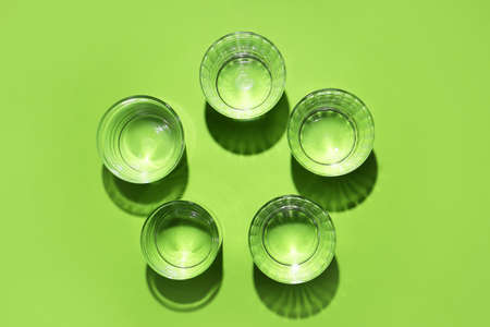 Shots of vodka or tequila on mint background