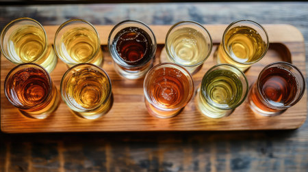 A visually striking arrangement of assorted beverages in clear glasses, presented on a rustic wooden tray. Perfect for culinary photography or showcasing drink options.