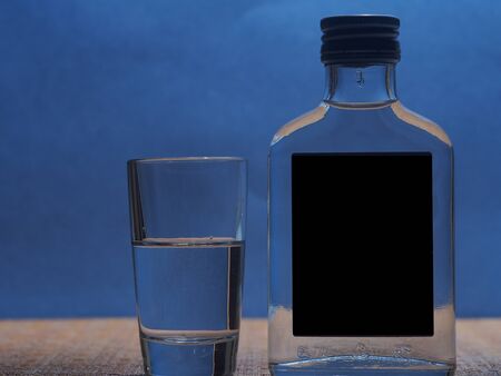 Glass and flat glass bottle on a blue background. Alcoholic beverages, vodka.
