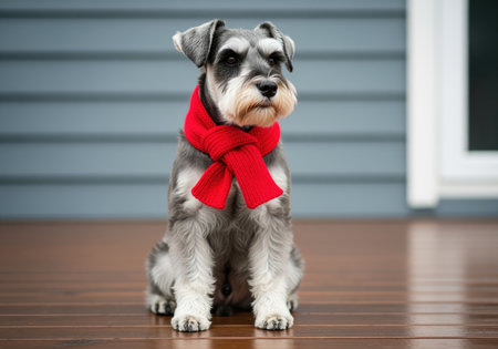 A charming miniature schnauzer dog sits attentively, sporting a vibrant red knitted scarf. this endearing portrait captures its playful and warm personality, perfect for pet related content.