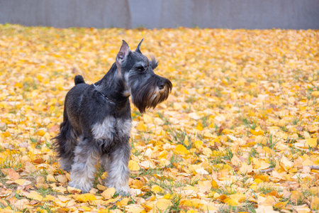 Schnauzer dog with leash standing on yellow autumn leaves in park, outdoor pet photography concept, seasonal atmosphere. Shared accommodation with pets. Walking dogs in the park.