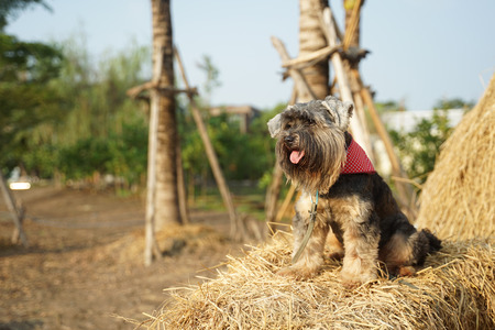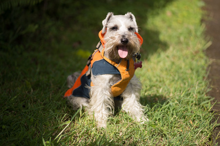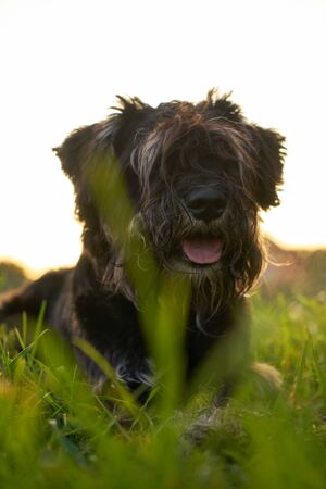 Miniature Schnauzer chilling in the grass during sunset. High quality photo