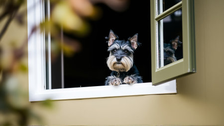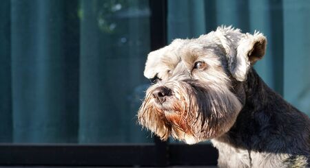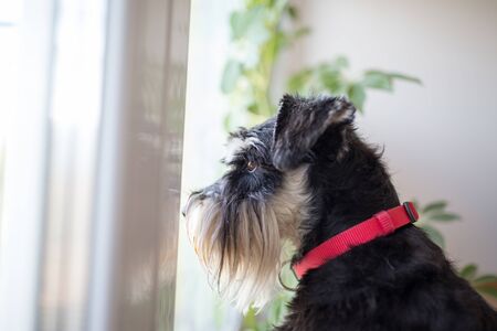 The dog wants to go for a walk. The Zwergschnauzer is looking at the street from the window of the house. In the yard, there are fresh spring foliage on the trees.