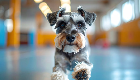 A spirited Miniature Schnauzer bounds forward with pure joy, its paws barely touching the ground. This dynamic, head-on action shot captures the playful energy and happy spirit of a beloved companion during an exciting moment of indoor play.