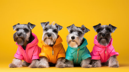 Miniature schnauzer dogs in colorful jackets on yellow background