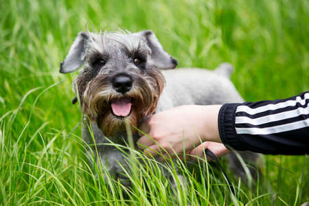 Gray miniature zwergschnauzer puppy is walking on a green lawn on nature in sunny day. Hunting, guarding dogs breed. Female doggy on a walk. Canine domestic animal, pet in green park, woods, forest.
