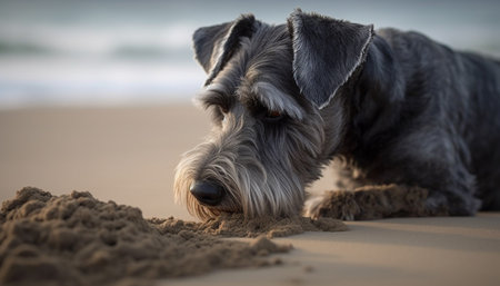 Happy Miniature Schnauzer Enjoying the Beach with Sunglasses. Perfect for Pet Lovers. Generative AI