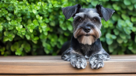 A charming schnauzer with distinctive facial features relaxes on a wooden bench. The dog