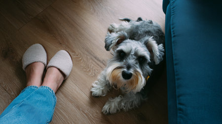 Schnauzer relaxes beside owner in cozy indoor setting with wooden floor