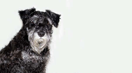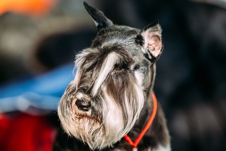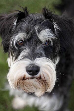 Miniature Schnauzer Dog Zwergschnauzer Close Up. Dwarf Schnauzer. Adult black-and-silver with natural ears, the long eyebrows and beard.