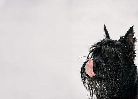 Portrait Of Young Black Giant Schnauzer Or Riesenschnauzer Dog At White Winter Snow Background