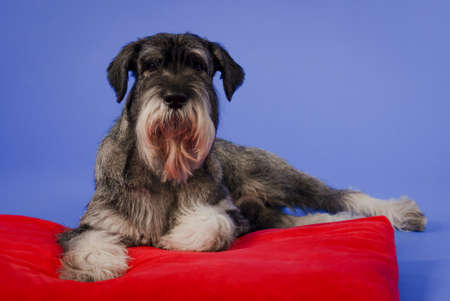 The Schnauzer lies with its front paws on a red pillow. Pet in the studio on a blue background. Close up.