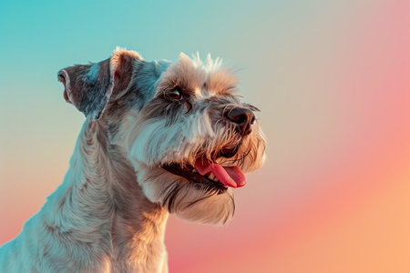 Portrait of a Gray Schnauzer Dog with Tongue Out Against Pink and Blue Gradient Background AI Generative
