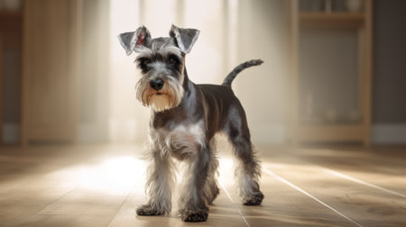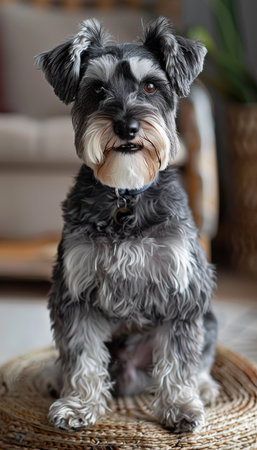 Behold the captivating portrait of an adorable Schnauzer! This charming canine companion sits poised on a cozy woven mat, its playful eyes gazing curiously towards the camera Set against a warm and inviting living room backdrop, the image perfectly captures the dog's endearing nature and fluffy allure, making it an irresistible addition to any home or pet lover's collection AI Generative