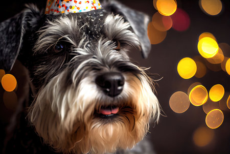 Happy Schnauzer dog in party with bokeh light background. Animal and pet concept. Generative AI