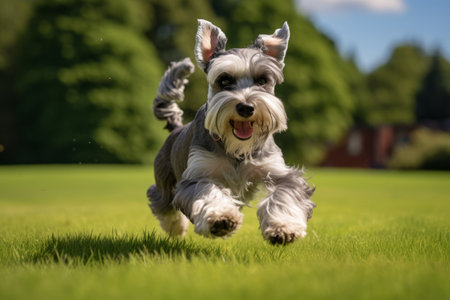 Energetic Grey and White Miniature Schnauzer Captured in Action on a Lush Green Grass Field: AR 3:2