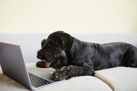 Beautiful black schnauzer lying on sofa at home and looking at computer monitor