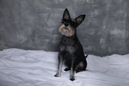 Adorable miniature schnauzer sitting on white bedclothes in home room. Black little german dog with mustachioed muzzle.