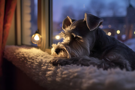 Schnauzer dog relaxing beside a person in a cozy indoor setting