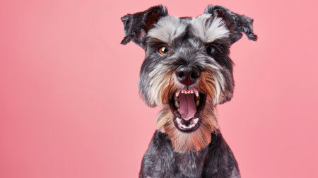Miniature Schnauzer, angry dog baring its teeth, studio lighting pastel background
