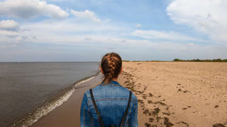 A woman with braided hair walking along the coastal line of a sandy beach by Baltic Sea on Sobieszewo island, Poland. The sea is gently waving. A bit of overcast. Solitude and serenity