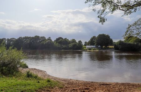 Beautiful lake view on a sunny day with a blue sky and reflections on the water surface