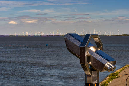 A closeup of metallic binoculars looking at the windmills in the distance across the lake