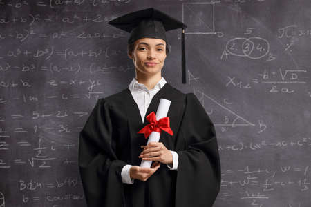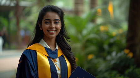 A proud young graduate in a cap and gown, holding a diploma, with a warm smile.