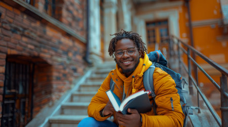 Happy student seated on campus steps, reading a book outdoors while wearing a yellow jacket and backpack.