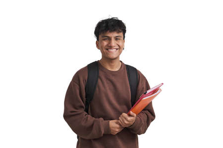 Young peruvian student smiling and looking at camera. Isolated over white background.