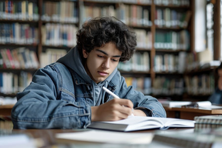 TEENAGE BOY SITTING AT THE DESK in the library WRITING homework. ai generated
