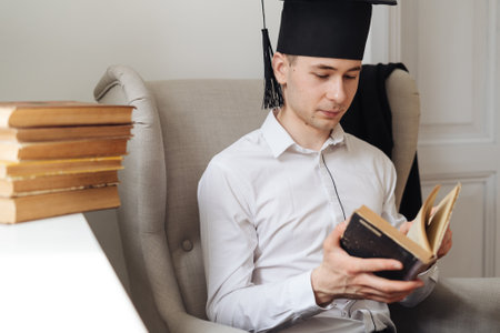 A man wearing a graduation gown is pictured reading a book. This image can be used to represent education, learning, or academic achievement.