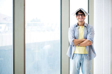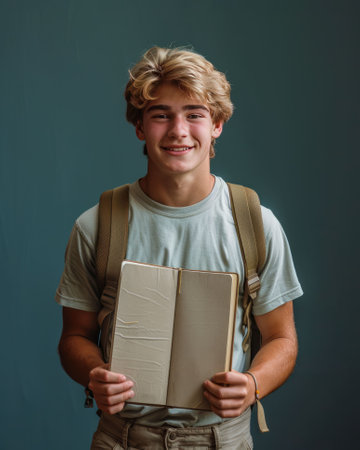 A young caucasiand blond guy student smiles while standing with a book with a blank cover in his hands. AI generative