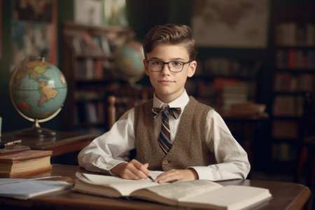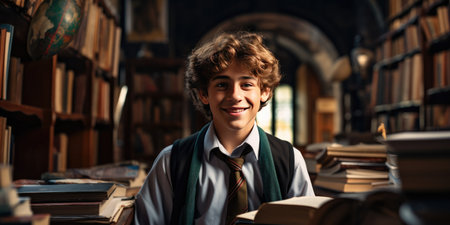 Portrait of a schoolboy in the library. School and learning theme. Generative AI