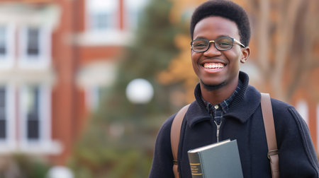 Portrait of a cheerful student on campus accompanied by friends, carrying books and enjoying a vibrant academic atmosphere. The outdoor environment enhances the feeling of learning, community, and youthful enthusiasm.