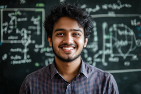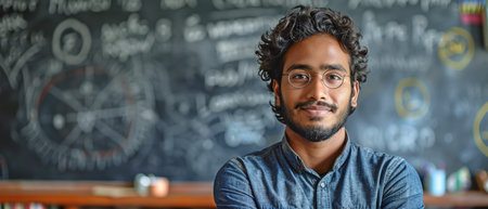 Happy Indian schoolboy with a backpack standing in front of a chalkboard in the classroom, smiling and showing confidence, representing a cheerful student in a positive school environment