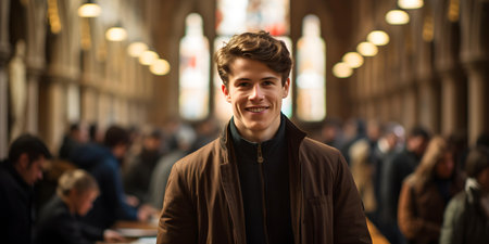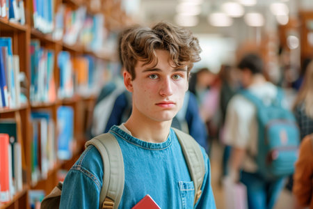 Portrait of a contemplative teenage boy in a library setting, with peers milling around in the softly blurred background
