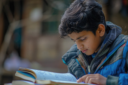 A young boy, wearing a blue jacket, is engrossed in reading a book outdoors. His focus and concentration are evident in his posture and expression.