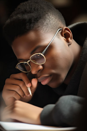 Student carefully focused on reading a book, wearing glasses, in a study environment.