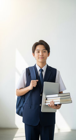 A Indonesian young boy in a school uniform sits thoughtfully with a pen, surrounded by study materials on a desk.
