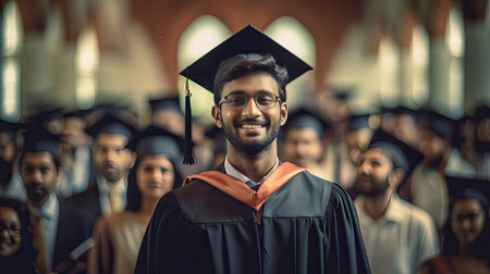 Happy indian male graduate against the background of university graduates. Generative Ai