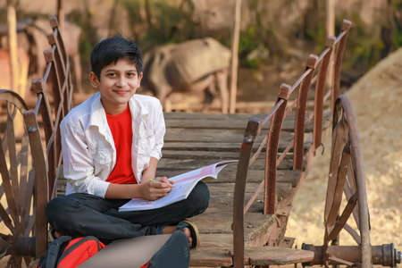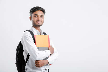 Studio portrait of a delighted Indian boy with a backpack standing isolated on a light background, holding a textbook