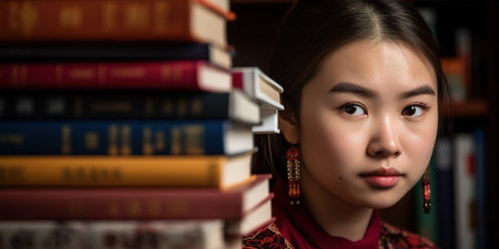 An Asian teenager in a cozy library corner, surrounded by wooden shelves filled with colorful books, subtle grain, soft focus edges, vintage photo, film simulation