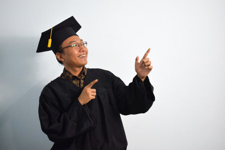 Expressive of Adult indonesia male wear graduation robe, hat and eyeglasses isolated on white background, expressions of portrait graduation